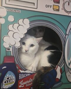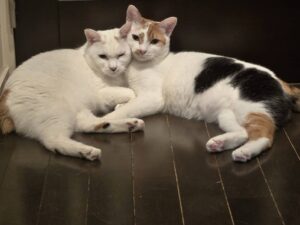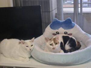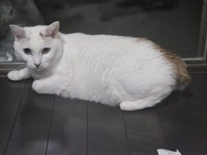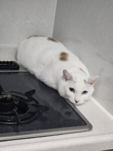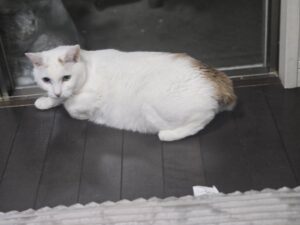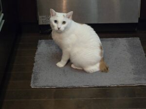 お尻の部分だけ茶色 足の裏が三毛柄、茶白に見える三毛さんです